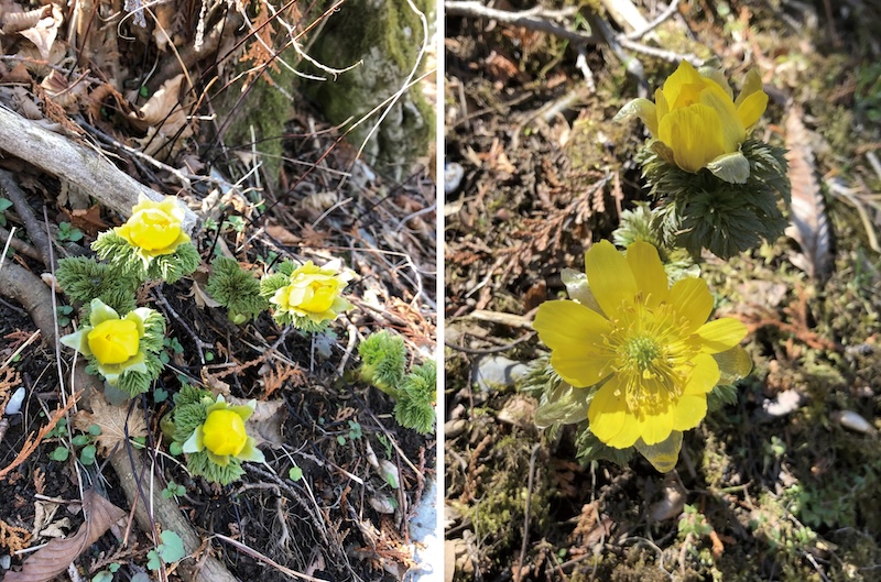 雪が雨に変わる雨水のころ、七十二候で3月上旬は〝草木萌動(そうもくめばえいずる)〟に当たります。雪解け水が大地を潤し、眠っていた植物が目覚め始める季節。山では冬枯れした枝に新芽の膨らみを見つけたり、落ち葉の間から若芽が顔をのぞかせていたり。中でも冬の間、寂しかった斜面にいち早く色を差してくれるのが「福寿草(フクジュソウ)」です。鮮やかな黄色い花が春の訪れを感じさせてくれます。日の光に敏感で、日が陰ると花を閉じてしまいます。これは、蜜を持たない福寿草が花の温度を保ち、昆虫を引き寄せるためです。開花時期は3月から4月初旬頃で、写真は三重県いなべ市北部に位置する藤原岳(ふじわらだけ・1140m)で撮影しました。藤原岳は福寿草やセツブンソウ、ユキワリソウなど早春の草花で彩られ、花の名山として人気です。